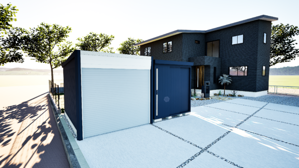 こちらの商品は、通常の倉庫のようなイメージではなく建物のブラックのタイル外壁に合うような上質でモダンなデザインのガレージです。