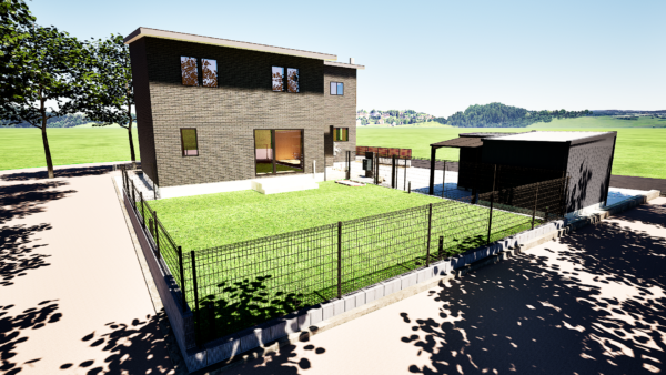 建物回りの防草シート+砂利敷き、境界部のフェンス、照明を配置して工事が完成となります。