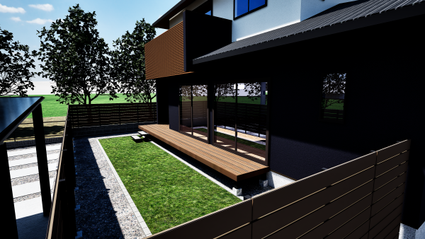 お庭部は、リビングの掃き出し窓から出入りができるようにウッドデッキを設置しました。