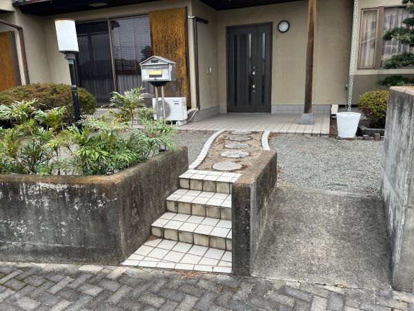 お客様のお悩みは、「階段部の邪魔な擁壁」「アプローチの微妙な段差」にご不満をいだいており、デザインもきれいにされたいとのことです。