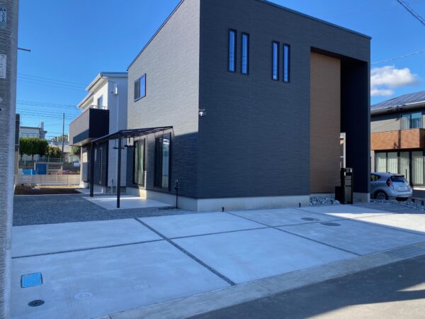 敷地が大きくシンプルモダンスタイルのデザイン性を高めるため、広いコンクリートの駐車場を配置しました。
